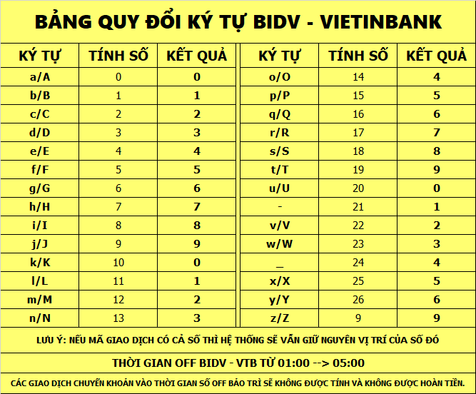 ĐỐI VỚI BIDV MÃ GD CÓ CHỨA CHỮ THÌ CHUYỂN ĐỔI SANG SỐ THEO BẢNG SAU